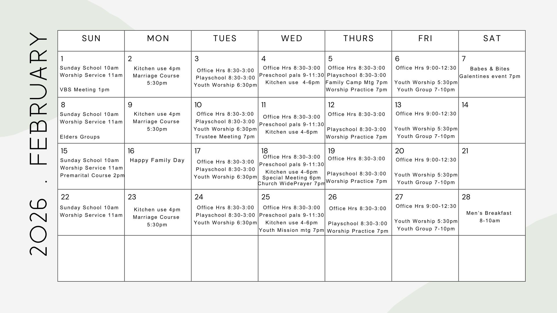 - Feb 28th: 8am to 10am-Men's Breakfast
