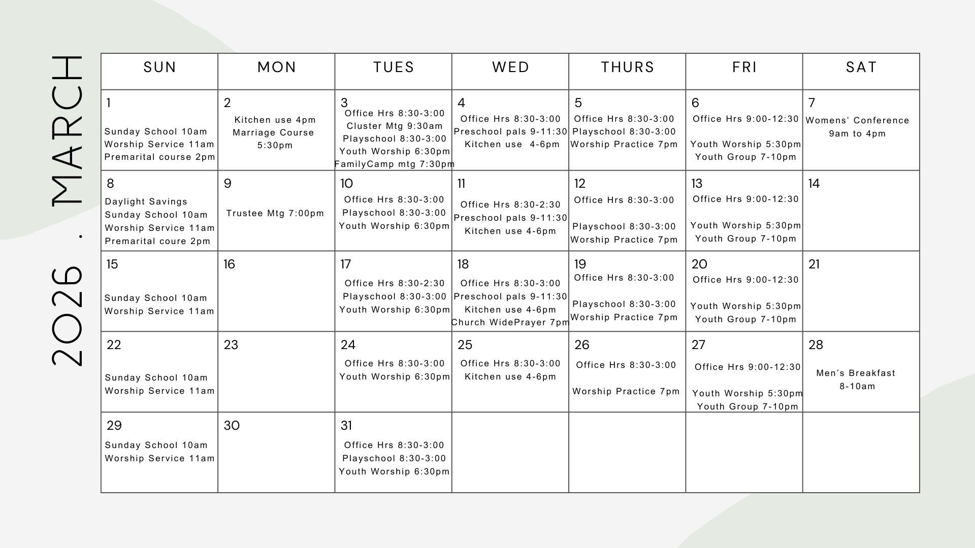 - March 7th: Grace & Grit Women's Conference 9am to 4pm.