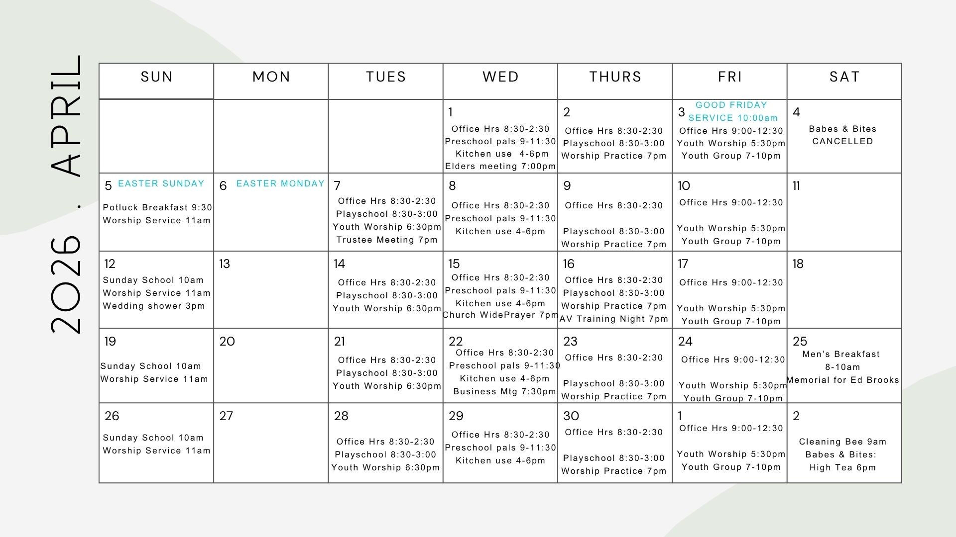 - April 3rd: Good Friday Service at 10:00am at Clive Baptist Church