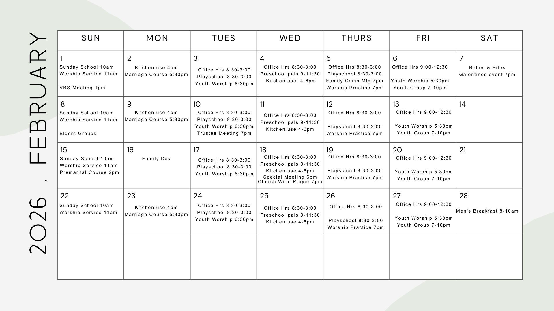 - Feb 28th: 8am to 10am-Men's Breakfast
